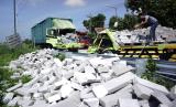 Warga menurunkan bata ringan dari atas truk yang mengalami kecelakaan di jalan raya Desa Glagahan, Kecamatan Perak, Kabupaten Jombang, Jawa Timur, Selasa (13/2/2024). Kecelakaan yang melibatkan truk nopol L 8262 UN bermuatan bata ringan dan truk boks nopol AD 8017 OC bermuatan paket tersebut mengakibatkan dua orang meninggal dunia di lokasi serta dua orang luka-luka, sementara polisi belum bisa menyimpulkan penyebab kecelakaan. (FOTO : ANTARA FOTO/Syaiful Arif)