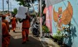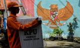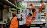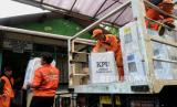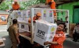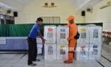 Petugas PPSU membantu petugas KPPS mendistribusikan kotak suara ke tempat pemungutan suara (TPS) di kawasan Cipinang, Jakarta Timur, Selasa (13/2/2024). KPU Jakarta Timur memastikan distribusi logistik Pemilu 2024 ke seluruh TPS di Jakarta Timur akan selesai pada hari ini atau H-1 pemungutan suara pada besok 14 Februari 2024. Sementara jumlah TPS di Jakarta Timur sebanyak 8.812 TPS, termasuk yang ada di panti sosial, rumah sakit, lembaga pemasyarakatan maupun rumah tahanan. (FOTO : Republika/Thoudy Badai)