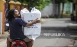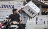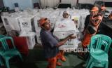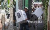 Petugas PPSU mengangkut kotak suara untuk didistribusikan di Posko Logistik Pemilu RW 08, Srengseng Sawah, Jakarta Selatan, Selasa (13/2/2024). Sebanyak 800 kotak suara beserta logistik lainnya didistribusikan untuk 200 tempat pemungutan suara (TPS) di 19 RW wilayah Srengseng Sawah. (FOTO : Republika/Putra M. Akbar)