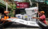 Petugas PPSU mengangkut kotak suara untuk didistribusikan di Kantor Kelurahan Srengseng Sawah, Jakarta Selatan, Selasa (13/2/2024). Sebanyak 800 kotak suara beserta logistik lainnya didistribusikan untuk 200 tempat pemungutan suara (TPS) di 19 RW wilayah Srengseng Sawah. (FOTO : Republika/Putra M. Akbar)