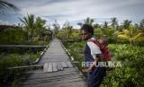 REPUBLIKA.CO.ID, PAPUA SELATAN -- Seorang mama Papua menggendong anaknya di Kampung Saw, Distrik Agats, Kabupaten Asmat, Papua Selatan, Selasa (13/2/2024). Kabupaten Asmat memiliki 224 kampung atau setara tingkat kelurahan yang berdiri di atas tanah berlumpur dan rawa serta memiliki sarana jalan dari papan kayu.