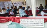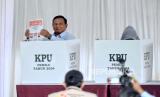 Calon presiden nomor urut 02, Prabowo Subianto menggunakan hak pilihnya di Tempat Pemungutan Suara (TPS) 033 Kampung Curug, Desa Bojong Koneng, Kecamatan Babakan Madang, Kabupaten Bogor, Jawa Barat, Rabu (14/2/2024). Prabowo hadir di lokasi sekitar pukul 09.00 WIB dengan mengenakan pakaian kemeja biru muda, celana biru navy dan topi. (FOTO : Republika/Thoudy Badai)