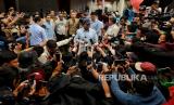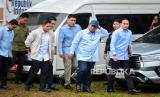 Prabowo hadir di lokasi sekitar pukul 09.00 WIB dengan mengenakan pakaian kemeja biru muda, celana biru navy dan topi.