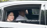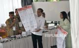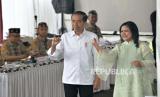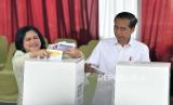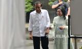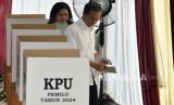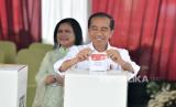 Presiden Joko Widodo bersama Ibu Negara Iriana Joko Widodo menggunakan hak pilihnya di Tempat Pemungutan Suara (TPS) 10 Kelurahan Gambir di kompleks Kantor Lembaga Administrasi Negara (LAN), Jakarta, Rabu (14/2/2024). Seusai menggunakan hak suara, Presiden dan Ibu Negara bertolak ke Istana Negara. Adapun Jumlah pemilih tetap di TPS 10 tempat Presiden Joko Widodo menggunakan hak suara ada 120 pemilih. (FOTO : Republika/Edwin Putranto)