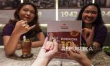 Petugas melayani warga untuk mendapatkan potongan harga di salah satu gerai makanan, Mal Kota Kasablanka, Jakarta, Rabu (14/2/2024). Sejumlah gerai makanan dan fashion di pusat perbelanjaan tersebut memberikan promo Pemilu 2024 dengan menunjukan jari kelingking yang bertinta ungu sebagai bukti telah melakukan pencoblosan. Program promo potongan harga tersebut untuk menggaet partisipasi Pemilu 2024 dan menekan angka golongan putih. (FOTO : Republika/Putra M. Akbar)