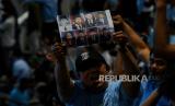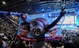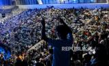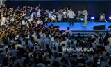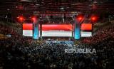 Pendukung paslon capres dan cawapres nomor urut 2 Prabowo Subianto dan Gibran Rakabuming Raka menyanyikan lagu Indonesia Raya dalam acara Mengawal Suara Rakyat, Pidato Prabowo Gibran di Istora Senayan, Jakarta, Rabu (14/2/2024). Berdasarkan quick count atau hitung cepat yang dilakukan Poltracking Indonesia dan Charta Politika pada Rabu pukul 20.15 dengan jumlah total suara sementara yang masuk sebesar 90 persen, Prabowo-Gibran unggul dengan memperoleh 59,22 persen suara disusul Anies-Muhaimin 24,43 persen suara dan Ganjar-Mahfud 16,35 persen suara. (FOTO : Republika/Thoudy Badai)