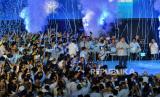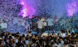 Pendukung paslon capres dan cawapres nomor urut 2 Prabowo Subianto dan Gibran Rakabuming Raka menghadiri acara Mengawal Suara Rakyat, Pidato Prabowo Gibran di Istora Senayan, Jakarta, Rabu (14/2/2024). Berdasarkan quick count atau hitung cepat yang dilakukan Poltracking Indonesia dan Charta Politika pada Rabu pukul 20.15 dengan jumlah total suara sementara yang masuk sebesar 90 persen, Prabowo-Gibran unggul dengan memperoleh 59,22 persen suara disusul Anies-Muhaimin 24,43 persen suara dan Ganjar-Mahfud 16,35 persen suara. (FOTO : Republika/Thoudy Badai)