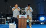 Paslon capres dan cawapres nomor urut 2 Prabowo Subianto dan Gibran Rakabuming Raka memanjatkan doa usai menyampaikan pidato kemenangan menurut quick count dihadapan pendukungnya di Istora Senayan, Jakarta, Rabu (14/2/2024). Berdasarkan quick count atau hitung cepat yang dilakukan Poltracking Indonesia dan Charta Politika pada Rabu pukul 20.15 dengan jumlah total suara sementara yang masuk sebesar 90 persen, Prabowo-Gibran unggul dengan memperoleh 59,22 persen suara disusul Anies-Muhaimin 24,43 persen suara dan Ganjar-Mahfud 16,35 persen suara. (FOTO : Republika/Thoudy Badai)