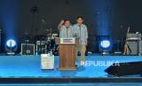 Paslon capres dan cawapres nomor urut 2 Prabowo Subianto dan Gibran Rakabuming Raka menyampaikan pidato kemenangan menurut quick count dihadapan pendukungnya di Istora Senayan, Jakarta, Rabu (14/2/2024). Berdasarkan quick count atau hitung cepat yang dilakukan Poltracking Indonesia dan Charta Politika pada Rabu pukul 20.15 dengan jumlah total suara sementara yang masuk sebesar 90 persen, Prabowo-Gibran unggul dengan memperoleh 59,22 persen suara disusul Anies-Muhaimin 24,43 persen suara dan Ganjar-Mahfud 16,35 persen suara. (FOTO : Republika/Thoudy Badai)