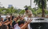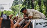 Capres Prabowo Subianto menyalami warga usai menziarahi makam bapaknya, Soemitro Djojohadikusumo di TPU Karet Bivak, Jakarta Pusat, Kamis (15/2/2024). (FOTO : EPA)