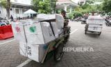 Tukang becak mengangkut logistik hasil Pemilu 2024 di Kantor Kecamatan Kenjeran, Surabaya, Jawa Timur, Kamis (15/2/2024). Usai penghitungan suara di setiap Tempat Pemungutan Suara (TPS), logistik Pemilu 2024 didistribusikan kembali dari TPS kepada Panitia Pemilihan Kecamatan (PPK) untuk disimpan dan selanjutnya dilakukan rekapitulasi hasil penghitungan suara pada Jumat (16/2/2024). (FOTO : ANTARA FOTO/Didik Suhartono)