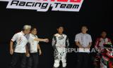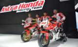 Pebalap Astra Honda Racing Team berpose di samping sepeda motor saat diperkenalkan dalam Indonesian International Motor Show (IIMS) 2024 di JIExpo Kemayoran, Jakarta, Kamis (15/2/2024). PT Astra Honda Motor mengumumkan 11 pebalap muda Astra Honda Racing Team untuk 2024 dan selama musim balap 2024 logo One Heart dan Satu Hati akan tertulis pada jersey pebalap dan motor balap tim Repsol Honda Team serta Honda Racing Corporation di ajang MotoGP, WSBK, dan MXGP. (FOTO : Dok Republika)