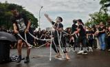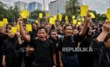 Aktivis HAM menggelar Aksi Kamisan ke-805 di depan Istana Merdeka, Jakarta, Kamis (15/2/2024). Aksi Kamisan ini menyinggung soal penyelenggaraan Pemilu 2024 dengan membacakan surat terbuka berjudul Hentikan Pengkhianatan terhadap Demokrasi dan Agenda Reformasi. Dalam aksi tersebut sejumlah aktivis HAM menggelar aksi teatrikal serta mengacungkan kartu kuning dan kartu merah oleh ibu dari korban tragedi Semanggi I, Sumarsih untuk mengecam praktik politik kotor dalam kontestasi Pemilu 2024. (FOTO : Republika/Thoudy Badai)