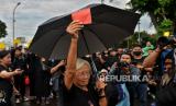 Ibu dari korban tragedi Semanggi I, Sumarsih mengacungkan kartu merah saat Aksi Kamisan ke-805 di depan Istana Merdeka, Jakarta, Kamis (15/2/2024). Aksi Kamisan ini menyinggung soal penyelenggaraan Pemilu 2024 dengan membacakan surat terbuka berjudul Hentikan Pengkhianatan terhadap Demokrasi dan Agenda Reformasi. Dalam aksi tersebut sejumlah aktivis HAM menggelar aksi teatrikal serta mengacungkan kartu kuning dan kartu merah oleh ibu dari korban tragedi Semanggi I, Sumarsih untuk mengecam praktik politik kotor dalam kontestasi Pemilu 2024. (FOTO : Republika/Thoudy Badai)