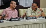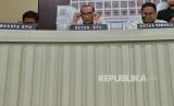 Ketua KPU RI Hasyim Asyari (kiri) bersama Ketua Bawaslu RI Rahmat Bagja (kanan) bersama anggota KPU lainnya menyampaikan keterangan pers di Gedung KPU RI, Jakarta, Kamis (15/2/2024). Dalam konferesi pers tersebut KPU bersama Bawaslu merespon dugaan perbedaan data hasil perolehan suara yang tercantum dalam formulir C Hasil Plano di TPS dengan hasil di aplikasi Sirekap. Menurutnya jika hasil yang tercantum dalam formulir C Hasil Plano yang diunggah ada yang salah hitung atau salah tulis akan dikoreksi dan dikonversi melalui aplikasi Sirekap. Ketua KPU mengklaim bahwa KPU Pusat telah memonitor daerah mana saja yang mengalami kesalahan antara unggahan formulir C Hasil Plano di TPS dengan konversi di aplikasinya. (FOTO : Republika/Thoudy Badai)