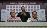 Ketua KPU RI Hasyim Asyari (tengah) bersama Ketua Bawaslu RI Rahmat Bagja (kanan) bersama anggota KPU Idham Holik (kiri) menyampaikan keterangan pers di Gedung KPU RI, Jakarta, Kamis (15/2/2024). Dalam konferesi pers tersebut KPU bersama Bawaslu merespon dugaan perbedaan data hasil perolehan suara yang tercantum dalam formulir C Hasil Plano di TPS dengan hasil di aplikasi Sirekap. Menurutnya jika hasil yang tercantum dalam formulir C Hasil Plano yang diunggah ada yang salah hitung atau salah tulis akan dikoreksi dan dikonversi melalui aplikasi Sirekap. Ketua KPU mengklaim bahwa KPU Pusat telah memonitor daerah mana saja yang mengalami kesalahan antara unggahan formulir C Hasil Plano di TPS dengan konversi di aplikasinya. (FOTO : Republika/Thoudy Badai)