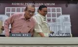 Ketua KPU RI Hasyim Asyari (kiri) bersama Ketua Bawaslu RI Rahmat Bagja (kanan) saat akan menyampaikan keterangan pers di Gedung KPU RI, Jakarta, Kamis (15/2/2024). Dalam konferesi pers tersebut KPU bersama Bawaslu merespon dugaan perbedaan data hasil perolehan suara yang tercantum dalam formulir C Hasil Plano di TPS dengan hasil di aplikasi Sirekap. Menurutnya jika hasil yang tercantum dalam formulir C Hasil Plano yang diunggah ada yang salah hitung atau salah tulis akan dikoreksi dan dikonversi melalui aplikasi Sirekap. Ketua KPU mengklaim bahwa KPU Pusat telah memonitor daerah mana saja yang mengalami kesalahan antara unggahan formulir C Hasil Plano di TPS dengan konversi di aplikasinya. (FOTO : Republika/Thoudy Badai)