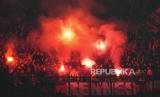 Suporter Rennes menyalakan flares pada pertandingan sepak bola leg pertama play-off Liga Europa antara AC Milan dan Rennes di Stadion San Siro, Milan, Italia, Jumat (16/2/2024) WIB. AC Milan mengalahkan Rennes dengan skor 3-0. (FOTO : AP Photo/Antonio Calanni)
