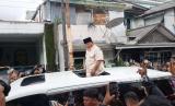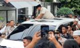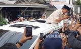 Calon Presiden nomor urut 2 Parbowo Subianto menyapa warga saat ziarah ke makam Habib Ali Kwitang di Masjid Al Riyadh, Kwitang, Jakarta Pusat, Jumat (16/2/2024) siang. Prabowo juga melakukan silaturahmi dengan Habib Ali bin Habib Abdurrahman bin Muhammad bin Ali Al Habsy yang merupakan cicit dari Habib Kwitang. (FOTO : Republika/Febryan A)