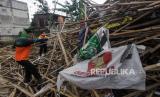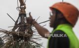 Petugas menyortir bambu bekas alat peraga kampanye di tempat penyaringan sampah TB Simatupang, Jakarta, Jumat (16/2/2024). Pemerintah Provinsi DKI Jakarta menampung 14.970 kilogram sampah alat peraga kampanye Pemilu 2024. Sampah alat peraga kampanye itu disortir kembali untuk dimanfaatkan bagian bambu dan kayu bekas alat peraga kampanye untuk diolah daur ulang menjadi pupuk kompos. (FOTO : Republika/Putra M. Akbar)