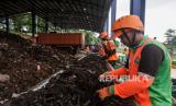 Petugas memilah sampah bekas alat peraga kampanye yang telah dicacah di tempat penyaringan sampah TB Simatupang, Jakarta, Jumat (16/2/2024). Pemerintah Provinsi DKI Jakarta menampung 14.970 kilogram sampah alat peraga kampanye Pemilu 2024. Sampah alat peraga kampanye itu disortir kembali untuk dimanfaatkan bagian bambu dan kayu bekas alat peraga kampanye untuk diolah daur ulang menjadi pupuk kompos. (FOTO : Republika/Putra M. Akbar)