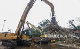 Petugas menggunakan alat berat mengangkut bambu bekas alat peraga kampanye di tempat penyaringan sampah TB Simatupang, Jakarta, Jumat (16/2/2024). Pemerintah Provinsi DKI Jakarta menampung 14.970 kilogram sampah alat peraga kampanye Pemilu 2024. Sampah alat peraga kampanye itu disortir kembali untuk dimanfaatkan bagian bambu dan kayu bekas alat peraga kampanye untuk diolah daur ulang menjadi pupuk kompos. (FOTO : Republika/Putra M. Akbar)