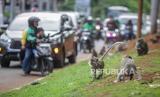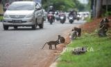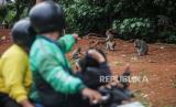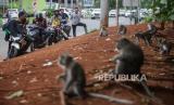 Sejumlah monyet ekor panjang (Macaca fascicularis) menunggu makanan dari warga di pinggir jalan di Kapuk Muara, Penjaringan, Jakarta Utara, Sabtu (17/2/2024). Meskipun sudah ada imbauan untuk tidak memberikan makan kepada satwa tersebut namun masih terdapat warga yang melanggar aturan tersebut. Pemberian makan monyet ekor panjang secara sembarang dapat berdampak kepada perilaku monyet ekor panjang setempat karena lebih memilih makan di luar wilayah margasatwa. (FOTO : Republika/Putra M. Akbar)