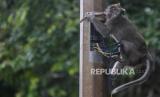 Seekor monyet ekor panjang (Macaca fascicularis) memanjat tiang di Kapuk Muara, Penjaringan, Jakarta Utara, Sabtu (17/2/2024). Meskipun sudah ada imbauan untuk tidak memberikan makan kepada satwa tersebut namun masih terdapat warga yang melanggar aturan tersebut. Pemberian makan monyet ekor panjang secara sembarang dapat berdampak kepada perilaku monyet ekor panjang setempat karena lebih memilih makan di luar wilayah margasatwa. (FOTO : Republika/Putra M. Akbar)