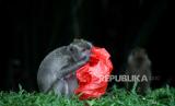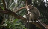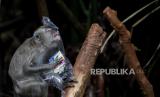 Seekor monyet ekor panjang (Macaca fascicularis) menjilat sampah plastik makanan di Kapuk Muara, Penjaringan, Jakarta Utara, Sabtu (17/2/2024). Meskipun sudah ada imbauan untuk tidak memberikan makan kepada satwa tersebut namun masih terdapat warga yang melanggar aturan tersebut. Pemberian makan monyet ekor panjang secara sembarang dapat berdampak kepada perilaku monyet ekor panjang setempat karena lebih memilih makan di luar wilayah margasatwa. (FOTO : Republika/Putra M. Akbar)