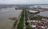 Foto udara kendaraan melaju perlahan di jalan pantura Demak-Kudus, Desa Wonorejo, Kecamatan Karanganyar, Kabupaten Demak, Jawa Tengah, Ahad (18/2/2024). Satlantas Polres Demak membuka kembali jalan tersebut setelah 10 hari terputus akibat terendam banjir dengan imbauan kepada seluruh pengendara untuk melaju perlahan, karena selain masih ada genangan banjir di sejumlah titik jalan juga masih digunakan relawan untuk mobilitas jalur pengiriman logistik untuk warga terdampak banjir serta untuk lokasi peristirahatan darurat pengungsi di pinggir jalan. (FOTO :  ANTARA FOTO/Aji Styawan)