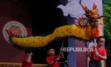 Tiga anak mengarak replika naga berukuran kecil saat pembukaan Festival Cap Go Meh di Jalan Diponegoro, Pontianak, Kalimantan Barat, Ahad (18/2/2024). Festival Cap Go Meh 2575 yang digelar pada tahun Naga Kayu selama sepekan ke depan tersebut disemarakkan dengan pentas seni dan budaya Tionghoa setempat serta pasar kuliner khas Pontianak. (FOTO : ANTARA FOTO/Jessica Wuysang)