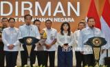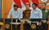 Presiden Joko Widodo (kiri) bersama Menteri Pertahanan Prabowo Subianto (kanan) saat meresmikan Rumah Sakit Pusat Pertahanan Negara (RSPPN) Panglima Besar Soedirman dan 20 rumah sakit milik TNI di Jakarta, Senin (19/2/2024). Kementerian Pertahanan meresmikan sebanyak 20 rumah sakit milik TNI yang terdiri dari 11 Rumah Sakit Angkatan Darat (RSAD), 3 Rumah Sakit Angkatan Laut (RSAL) dan 6 Rumah Sakit Angkatan Udara (RSAU). Pembangunan fasilitas kesehatan tersebut diharapkan dapat memenuhi kebutuhan kesehatan bagi anggota Kemhan atau TNI beserta keluarganya dan masyarakat umum agar dapat terpenuhi. (FOTO : Republika/Thoudy Badai)