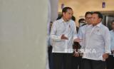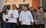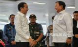 Presiden Joko Widodo berbincang bersama Menteri Pertahanan Prabowo Subianto saat meninjau Rumah Sakit Pusat Pertahanan Negara (RSPPN) Panglima Besar Soedirman dan 20 rumah sakit milik TNI di Jakarta, Senin (19/2/2024). Kementerian Pertahanan meresmikan sebanyak 20 rumah sakit milik TNI yang terdiri dari 11 Rumah Sakit Angkatan Darat (RSAD), 3 Rumah Sakit Angkatan Laut (RSAL) dan 6 Rumah Sakit Angkatan Udara (RSAU). Pembangunan fasilitas kesehatan tersebut diharapkan dapat memenuhi kebutuhan kesehatan bagi anggota Kemhan atau TNI beserta keluarganya dan masyarakat umum agar dapat terpenuhi. (FOTO : Republika/Thoudy Badai)