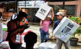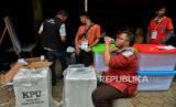 Anggota KPPS membawa kotak suara untuk dilakukan rekap penghitungan surat suara dari seluruh TPS di Kecamatan Kebayoran Lama di Kantor Kecamatan Kebayoran Lama, Jakarta Selatan, Senin (19/2/2024). Penghitungan surat suara tersebut dilakukan untuk seluruh TPS di 6 kelurahan yang berada di wilayah Kecamatan Kebayoran Lama untuk dilakukan verifikasi ulang dengan mencocokan jumlah suara dengan daftar pemilih sebagai upaya untuk mengantisipasi kesalahan input data sebelum seluruh surat suara diserahkan ke KPU Kota Jakarta Selatan. (FOTO : Republika/Thoudy Badai)