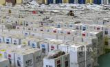 Petugas Panitia Pemilihan Kecamatan (PPK) Tanah Abang menata kotak suara untuk melakukan rapat pleno rekapitulasi hasil penghitungan suara secara manual tingkat Kecamatan di GOR Tanah Abang, Jakarta, Senin (19/2/2024). Komisi Pemilihan Umum (KPU) menghentikan sementara Sistem Informasi Rekapitulasi (Sirekap) dan akan melakukan akurasi atau sinkronisasi data numerik tampilan publik di laman pemilu2024.kpu.go.id dengan data otentik yang ada dalam foto formulir model C. (FOTO : ANTARA FOTO/Galih Pradipta)