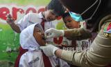 Dokter meneteskan vaksin polio jenis imunisasi novel Oral Polio Vaccine Type 2 (nOPV2) kepada seorang siswa di SDN Sawah Besar 2, Semarang, Jawa Tengah, Senin (19/2/2024). Kementerian Kesehatan menggelar Sub Pekan Imunisasi Nasional (PIN) Polio tahun 2024 putaran kedua secara serentak di tiga provinsi dan satu kabupaten yakni Jawa Tengah, Jawa Timur, DIY, dan Sleman dengan total sasaran 8,4 juta anak berusia 0-7 tahun selama tujuh hari sebagai upaya menanggulangi kejadian luar biasa (KLB) polio. (FOTO : ANTARA FOTO/Makna Zaezar)