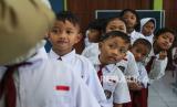 Sejumlah siswa menunggu giliran untuk mendapatkan tetesan vaksin polio jenis imunisasi novel Oral Polio Vaccine Type 2 (nOPV2) di SDN Sawah Besar 2, Semarang, Jawa Tengah, Senin (19/2/2024). Kementerian Kesehatan menggelar Sub Pekan Imunisasi Nasional (PIN) Polio tahun 2024 putaran kedua secara serentak di tiga provinsi dan satu kabupaten yakni Jawa Tengah, Jawa Timur, DIY, dan Sleman dengan total sasaran 8,4 juta anak berusia 0-7 tahun selama tujuh hari sebagai upaya menanggulangi kejadian luar biasa (KLB) polio. (FOTO : ANTARA FOTO/Makna Zaezar)