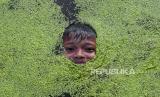 Seorang anak bermain air saat banjir merendam Desa Sungai Bungur di Muaro Jambi, Jambi, Selasa (20/2/2024). Banjir yang menggenangi ratusan rumah akibat meluapnya Sungai Batanghari yang telah berlangsung lebih dari delapan minggu tersebut menghambat aktivitas warga serta peniadaan kegiatan sekolah secara tatap muka tersebut. (FOTO : ANTARA FOTO/Wahdi Septiawan)