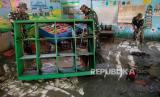 Prajurit TNI Kodim 0716/Demak membersihkan ruang kelas taman kanak-kanak (TK) Marsudi Rini pascabanjir di Desa Karanganyar, Kabupaten Demak, Jawa Tengah, Selasa (20/2/2024). Ratusan personel dari TNI-Polri, BPBD Kabupaten Demak, lintas instansi dan relawan dari berbagai komunitas bergotong royong melaksanakan karya bhakti pembersihan sejumlah fasilitas umum seperti sekolahan, puskesmas, polsek, dan koramil dan jalan desa setempat guna membantu percepatan penanganan banjir di Kabupaten Demak pada hari ke tiga belas akibat jebolnya Sungai Wulan-Jratun pada Kamis (8/2) lalu. (FOTO : ANTARA FOTO/Aji Styawan)