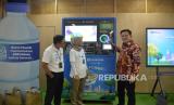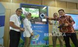 Direktur Utama PT Jamkrindo Akhmad Purwakajaya (kanan) mencoba mesin penukaran sampah botol plastik didampingi Direktur Keuangan dan Investasi Jamkrindo Alia Nur Fitri (dua kiri) dan Direktur Operasional dan Jaringan Jamkrindo Suwarsito (kiri) saat peluncuran program Trash4Cash di Gedung Jamkrindo, Kemayoran, Jakarta, Rabu (21/2/2024). Sebagai salah satu strategi untuk meningkatkan keterlibatan pegawai dalam penerapan prinsip-prinsip ESG, Jamkrindo berkolaborasi dengan Republika dan Plastic Pay meluncurkan program Trash4Cash. Peluncuran tersebut dilakukan bertepatan dengan Hari Peduli Sampah Nasional yang jatuh pada 21 Februari 2024. (FOTO : Republika/Prayogi)
