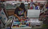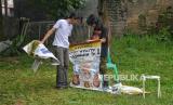 Kelompok perekayasa barang Gudskul Rekayasa dan Dicoba-coba (GudRnD) memilah Alat Peraga Kampanye (APK) untuk kemudian di proses daur ulang di Jagakarsa, Jakarta, Rabu (21/2/2024). Gudrnd bersama Stuffo menyulap sampah APK tersebut menjadi benda lebih bermanfaat seperti material baru yang disebut dengan Multiflex. Multiflex berasal dari beberapa lapis benner ini memiliki ketebalan dan karakteristik menyerupai dengan kayu sehingga bisa direspon menjadi furniture yang sebelumnya berbahan dasar kayu seperti meja, bangku dan benda lainnya. (FOTO : Republika/Prayogi)