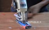 Kelompok perekayasa barang Gudskul Rekayasa dan Dicoba-coba (GudRnD) melakukan proses mendaur ulang sampah Alat Peraga Kampanye (APK) di Jagakarsa, Jakarta, Rabu (21/2/2024). Gudrnd bersama Stuffo menyulap sampah APK tersebut menjadi benda lebih bermanfaat seperti material baru yang disebut dengan Multiflex. Multiflex berasal dari beberapa lapis benner ini memiliki ketebalan dan karakteristik menyerupai dengan kayu sehingga bisa direspon menjadi furniture yang sebelumnya berbahan dasar kayu seperti meja, bangku dan benda lainnya. (FOTO : Republika/Prayogi)