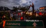 Petugas BPBD, Basarnas dan Dinas Pemadam Kebakaran mengevakuasi pohon tumbang pascaputing beliung di Jalan Nasional Bandung Garut di Rancaekek, Kabupaten Bandung, Jawa Barat, Rabu (21/2/2024). BPBD Provinsi Jawa Barat tengah mendata kerusakan bangunan dan korban akibat bencana puting beliung yang terjadi di Rancaekek pada Rabu petang tersebut. (FOTO : ANTARA FOTO/Raisan Al Farisi)