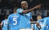 Pemain Napoli Victor Osimhen melakukan selebrasi seusai mencetak gol ke gawang Barcelona saat pertandingan sepak bola leg pertama Liga Champions, babak 16 besar di stadion Diego Maradona di Naples, Italia, Kamis (22/2/2024) WIB. Napoli bermain imbang 1-1 dengan Barcelona. Barcelona memimpin lebih dulu lewat gol Robert Lewandowski di menit ke-60. Napoli menyamakan kedudukan setelah Victor Osimhen mencetak gol di menit ke-75. Skor imbang 1-1 bertahan hingga akhir pertandingan. (FOTO : AP Photo/Gregorio Borgia)