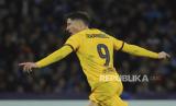 Pemain Barcelona Robert Lewandowski melakukan selebrasi seusai mencetak gol ke gawang Napoli saat pertandingan sepak bola leg pertama Liga Champions, babak 16 besar di stadion Diego Maradona di Naples, Italia, Kamis (22/2/2024) WIB. Napoli bermain imbang 1-1 dengan Barcelona. Barcelona memimpin lebih dulu lewat gol Robert Lewandowski di menit ke-60. Napoli menyamakan kedudukan setelah Victor Osimhen mencetak gol di menit ke-75. Skor imbang 1-1 bertahan hingga akhir pertandingan. (FOTO : Alessandro Garofalo/LaPresse via AP)