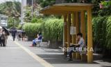 Warga duduk di halte di kawasan Sudirman, Jakarta, Kamis (22/2/2024). Hari tanpa bayangan atau kulminasi utama akan terjadi dua kali dalam setahun 2024, yang disebabkan posisi Indonesia berada di sekitar ekuator. Periode pertama fenomena tersebut akan terjadi di Indonesia pada 21 Februari 2024 di Baa, Nusa Tenggara Timur hingga 4 April 2024 di Sabang Aceh dan periode kedua hari tanpa bayangan dimulai 7 September 2024 hingga 21 Oktober 2024. (FOTO : Republika/Putra M. Akbar)