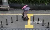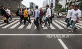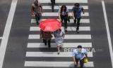 Warga berjalan melintasi pelican crossing di kawasan Sudirman, Jakarta, Kamis (22/2/2024). Hari tanpa bayangan atau kulminasi utama akan terjadi dua kali dalam setahun 2024, yang disebabkan posisi Indonesia berada di sekitar ekuator. Periode pertama fenomena tersebut akan terjadi di Indonesia pada 21 Februari 2024 di Baa, Nusa Tenggara Timur hingga 4 April 2024 di Sabang Aceh dan periode kedua hari tanpa bayangan dimulai 7 September 2024 hingga 21 Oktober 2024. (FOTO : Republika/Putra M. Akbar)