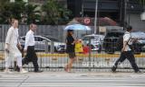 Warga berjalan di trotoar di kawasan Sudirman, Jakarta, Kamis (22/2/2024). Hari tanpa bayangan atau kulminasi utama akan terjadi dua kali dalam setahun 2024, yang disebabkan posisi Indonesia berada di sekitar ekuator. Periode pertama fenomena tersebut akan terjadi di Indonesia pada 21 Februari 2024 di Baa, Nusa Tenggara Timur hingga 4 April 2024 di Sabang Aceh dan periode kedua hari tanpa bayangan dimulai 7 September 2024 hingga 21 Oktober 2024. (FOTO : Republika/Putra M. Akbar)