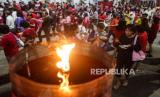 Warga keturunan Tionghoa mengantre untuk mengambil makanan saat perayaan cap go meh di Vihara Amurva Bhumi, Karet Semanggi, Setiabudi, Jakarta Selatan, Jumat (23/2). Cap Go Meh yang merupakan penutup perayaan Tahun Baru Imlek tersebut diisi dengan hiburan organ tunggal serta sajian makanan khas seperti lontong cap gomeh, kue pancong, dan martabak. (FOTO : Republika/Putra M. Akbar)