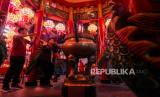 Warga keturunan Tionghoa melaksanakan sembahyang saat perayaan cap go meh di Vihara Amurva Bhumi, Karet Semanggi, Setiabudi, Jakarta Selatan, Jumat (23/2). Cap Go Meh yang merupakan penutup perayaan Tahun Baru Imlek tersebut diisi dengan hiburan organ tunggal serta sajian makanan khas seperti lontong cap gomeh, kue pancong, dan martabak. (FOTO : Republika/Putra M. Akbar)